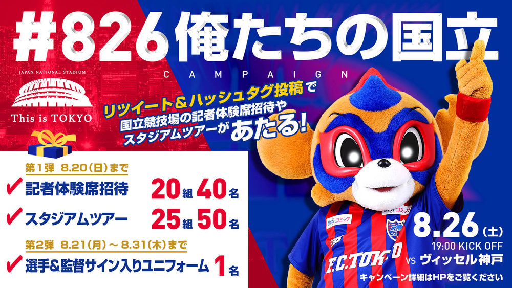 请在Twitter上附加活动标签“#826我们的国立”进行发布,并转发FC东京官方账号发布的活动通知帖子,即可完成参与。