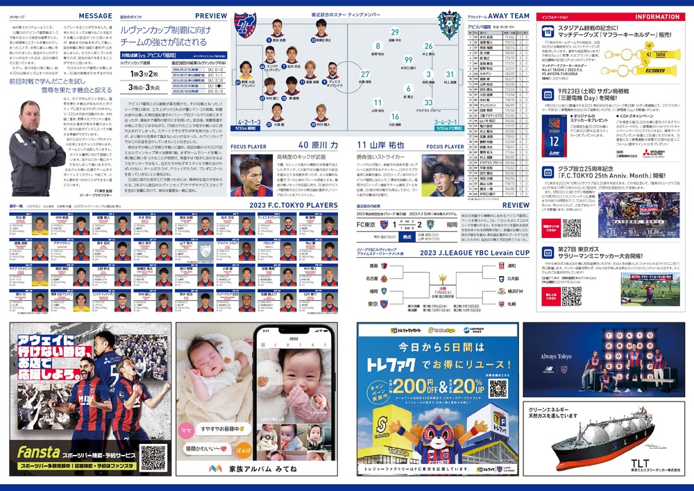 9/6(周三) 福冈战 官方比赛日程程序说明 2023/9/5 比赛信息 9月6日(周三) 2023 J联赛YBC Levain杯 主要阶段 四分之一决赛 第1战 vs Avispa福冈(19:00开球/味之素体育馆)的官方比赛日程程序,现通知如下。 □官方比赛日程2023</span></strong>【采访】东庆悟 选手・页数:B4尺寸(对折)4页※可从页面底部的PDF查看。 ◇比赛信息请点击这里</strong> ▽PDF查看请点击这里 2023官方比赛日程程序(0906 YLC四分之一决赛 Avispa福冈).pdf