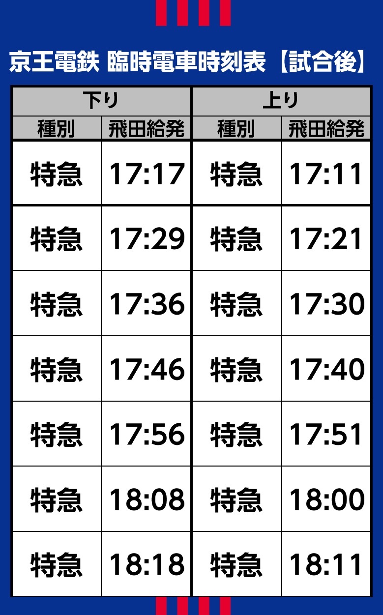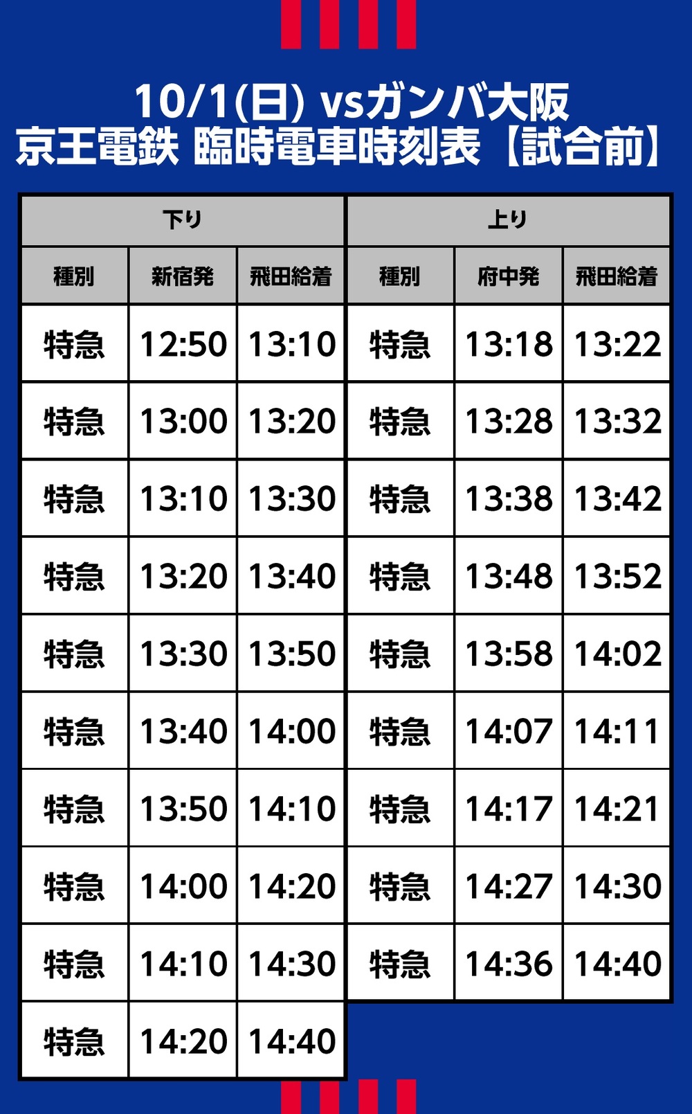 10月1日(周日) 2023明治安田生命J1联赛 第29轮 vs Gamba大阪(15:00开球/味之素体育馆)期间运营的临时交通接驳(铁路)、穿梭巴士・线路巴士相关信息。