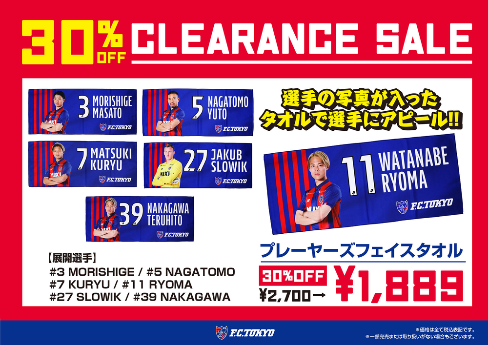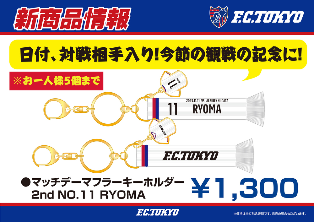 11/11(周六) 新潟战 商品售卖店开业通知 2023/11/9 商品 2023年11月11日(周六) 明治安田生命J1联赛 第32轮 vs Albirex新潟 (14:00开球/DENKA大天鹅体育场) 将销售FC东京商品。请作为观赛纪念务必购买。 《PICK UP》□【客场】比赛日限定围巾钥匙扣 渡边凌磨选手 ※每笔结账最多可购买5件商品。敬请谅解。 ※我们还准备了许多其他商品。 □销售地点・时间 【地点】天鹅公园客场商品售卖处 【时间】10:00~比赛结束后约30分钟 ※根据情况,销售时间可能会有所前后