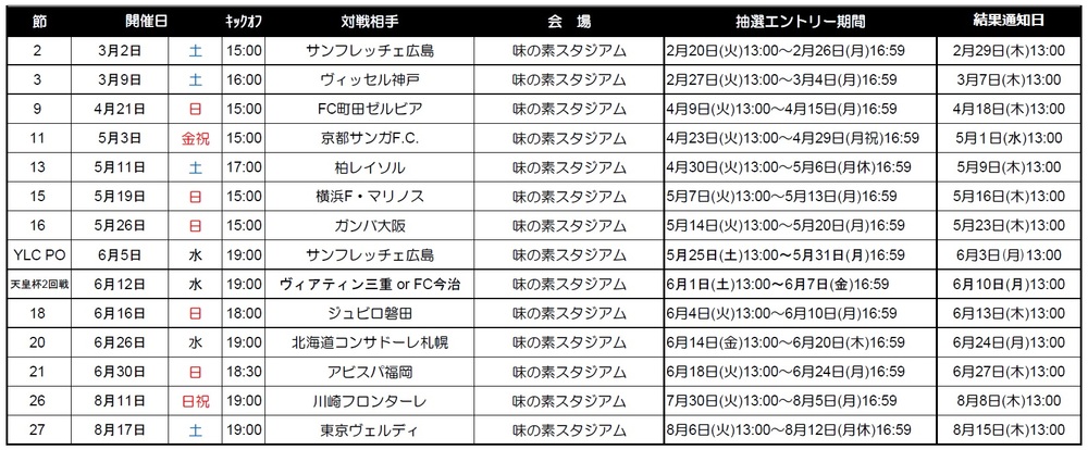 6月5日(周三)2024 J联赛YBC Levain杯 季后赛阶段 第1战vsSanfrecce广岛(19:00开球/味之素体育馆)、6月12日(周三)天皇杯 JFA 第104届全日本足球锦标赛 第2轮vsVeertien三重或FC今治(19:00开球/味之素体育馆)的抽签报名期间已记载。