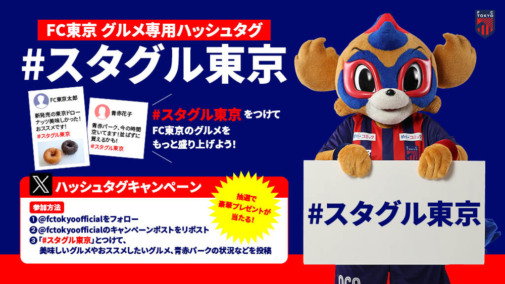 在AO-AKA PARK、场内售货亭、原创美食、球员合作美食等,发布您认为美味的美食时,请加上“#スタグル東京”,一起来为FC东京的美食助威吧!