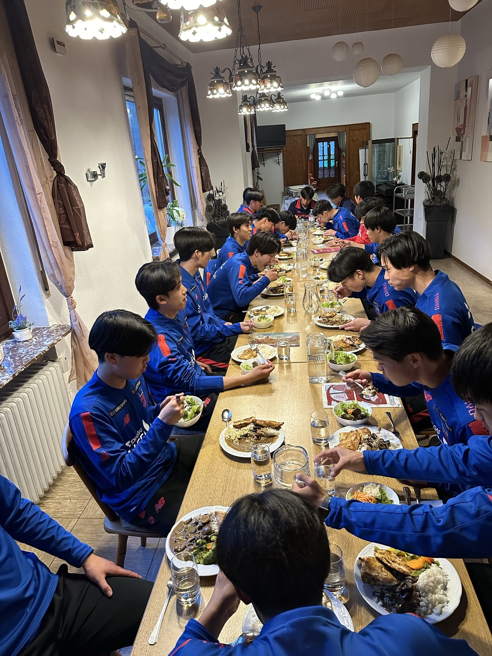 抵达住宿后,原计划进行训练,但由于大雨影响,训练被取消。改为散步。晚餐享用了德国料理,直到最后都在享受当地的美食。