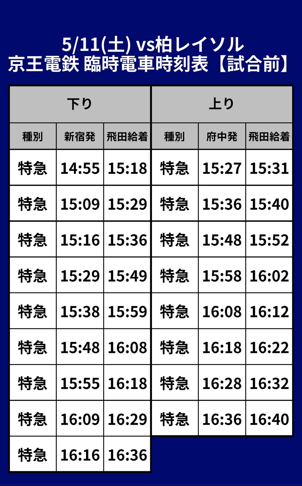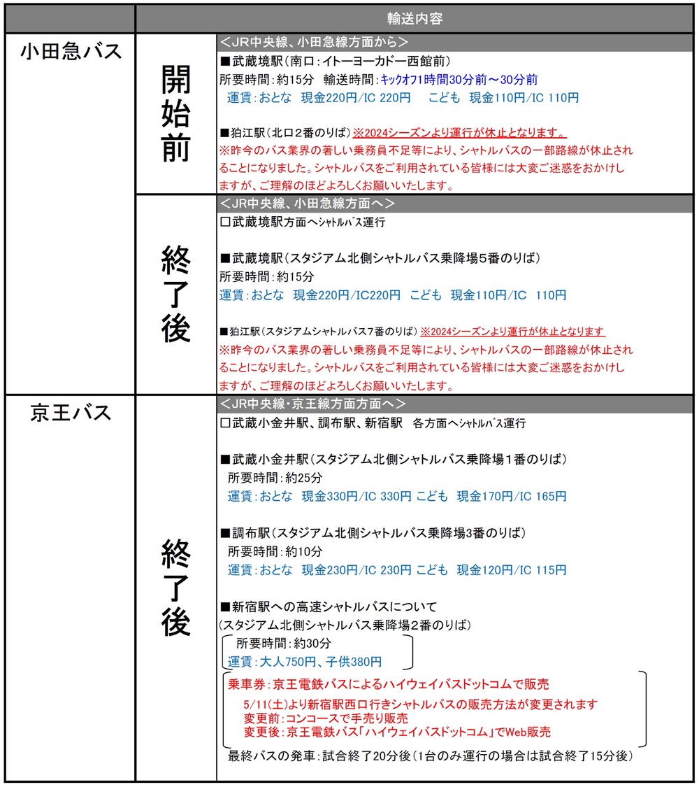 5月11日(周六) 2024明治安田J1联赛 第13轮 vs柏太Reysol(17:00开球/味之素体育馆)期间运营的临时交通接驳(铁路)、穿梭巴士及线路巴士的相关信息。