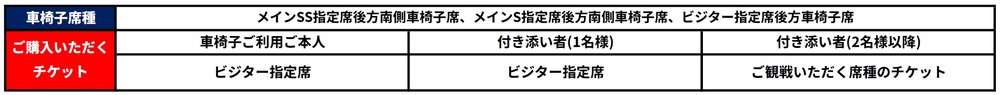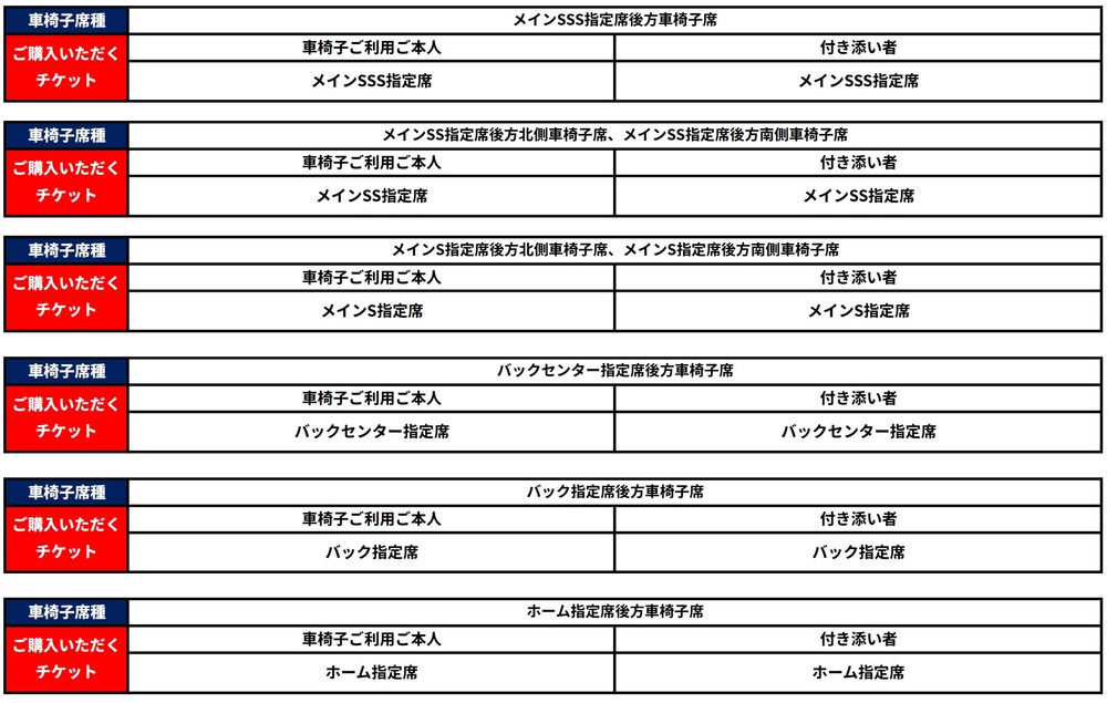 ※仅限穿着客队制服和商品观赛的轮椅席种为主看台SS指定席后方南侧轮椅席、主看台S指定席后方南侧轮椅席、客队指定席后方轮椅席。