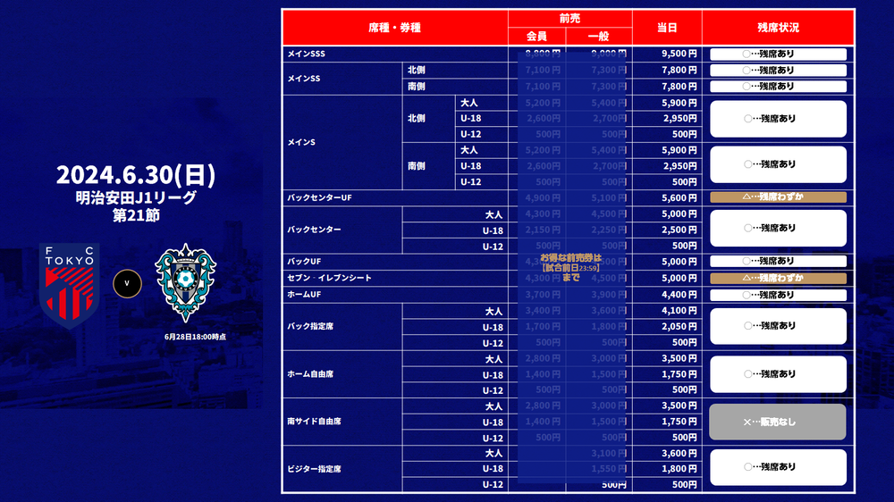 ※比赛当天不会在会场出售当日票。仅通过FC东京(J联赛票务)销售。
