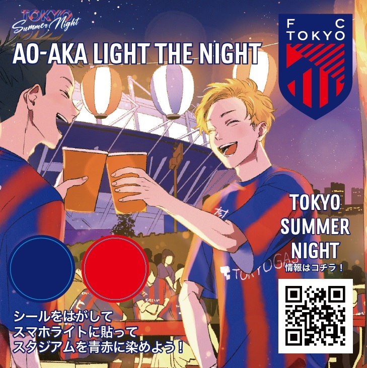 TOKYO SUMMER NIGHT作为一部分,2024年8月11日(周日祝) 明治安田J1联赛第26轮对阵川崎Frontale的比赛(19:00开球/味之素体育馆)将向前来观赛的前20,000名观众发放『AO-AKA LIGHT THE NIGHT』贴纸。