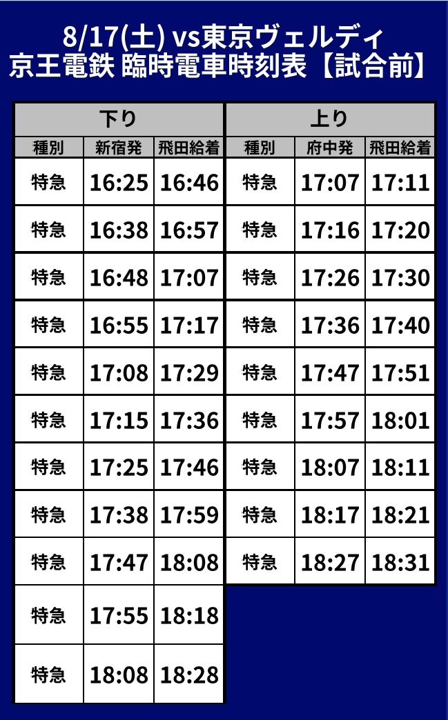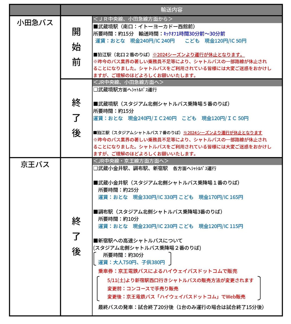 8月17日(周六) 2024明治安田J1联赛 第27轮 vs Verdy(19:00开球/味之素体育馆)期间运营的临时交通接驳(铁路)、穿梭巴士及线路巴士相关信息。