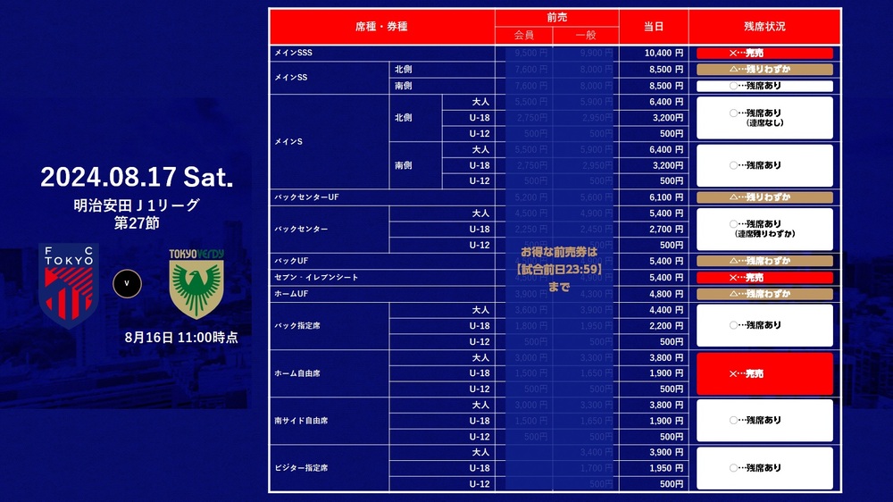 2024明治安田 J1联赛 第27轮 FC东京 vs Verdy(19:00开球/味之素体育馆)当天票销售情况通知如下。