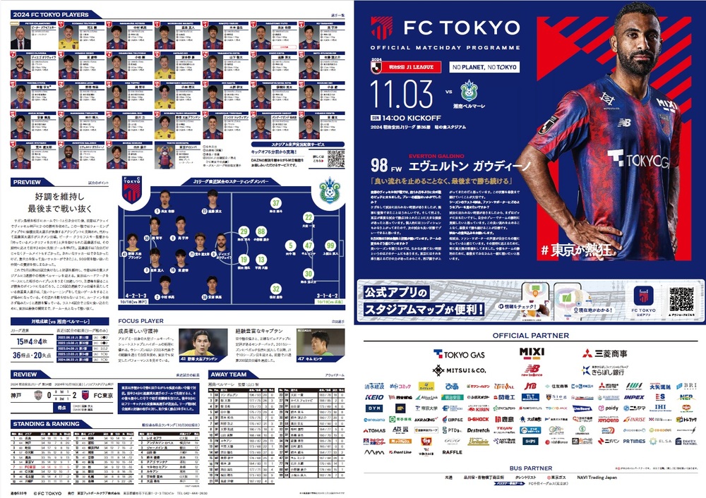 11/3(周日祝)湘南战 官方比赛日程程序相关 2024/11/2 比赛信息 11月3日(周日祝) 2024明治安田J1联赛 第35轮 vs湘南Bellmare(14:00开球/味之素体育馆)的官方比赛日程安排如下。 □官方比赛日程2024</span></strong>【采访】Ewerton Gaudino球员・页数:B4尺寸(对折)4页※可从页面底部的PDF查看。 ◇比赛信息请点击这里</strong> ▽PDF查看请点击这里 20241103_湘南战比赛日程序.pdf