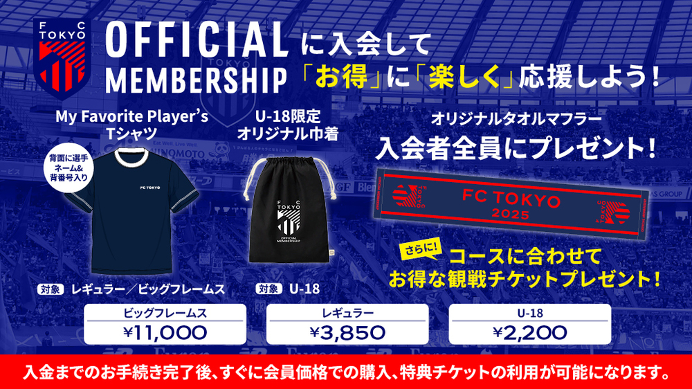 关于“2025 FC TOKYO 官方会员”的会员招募,现通知如下。对于2024官方会员 BIGFLAMES PREMIUM的会员,设有优先续订期间,欲续订者请尽早办理手续。