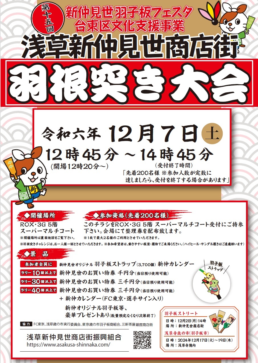 12/7(周六) 浅草出现了"TOKYO DOROMPA"! 2024/12/3 活动 12月7日(周六) TOKYO DOROMPA 将出现在东京的地标之一“浅草”!请务必来见TOKYO DOROMPA。敬请期待! □活动概要【活动名称】第十五届 浅草新仲见世商店街 羽毛球比赛 【时间・地点】<时间>12:45~14:45※TOKYO DOROMPA将在上述活动时间内分多次出现。 <地点>ROX・3G 5楼 超级多功能场地(台东区浅草1-26-51 浅草ROX) ◇活动详情请见这里