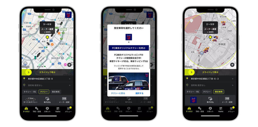 启动出租车应用“S.RIDE”,点击屏幕右上方显示的“FC东京 热狂出租车”图标,选择“使用”,即可叫车。请注意,无法指定包裹车或特定车辆叫车,敬请谅解。