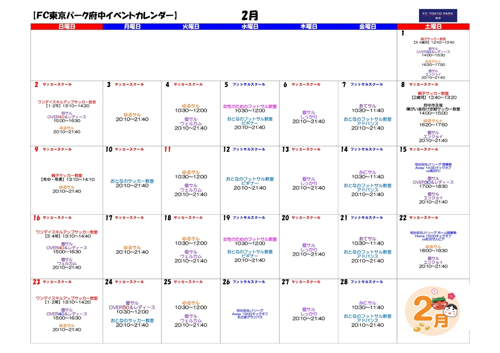 在FC东京公园府中举办的2月份活动,您可以接受FC东京普及部教练的指导,特此通知。