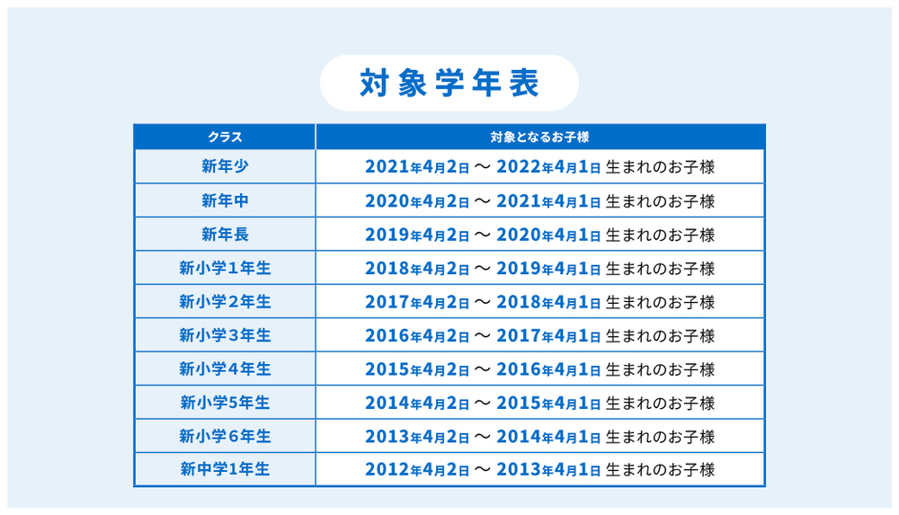 ※国立学校的周六课程仅限小学2年级及以下,调布飞田给・南大泽学校的周日课程仅限小学2年级及以下,府中学校的周日课程设有小学3年级及以下的班级,因此在升入下一学年时,需要转到其他课程或其他学校场地。如果希望的课程没有空位,将进入候补名单。