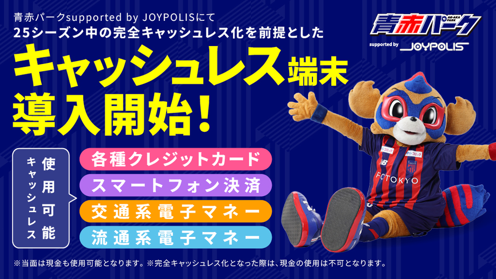 由FC东京运营的活动区域“AO-AKA PARK supported by JOYPOLIS”支持主要各种信用卡、智能手机支付、交通电子货币、流通电子货币的使用。