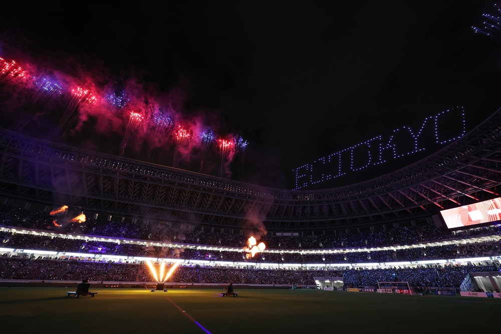 约400架无人机在日本国立体育场上空飞行的表演,此外,屋顶还将发射特殊效果烟花,并进行移动灯光照明表演。