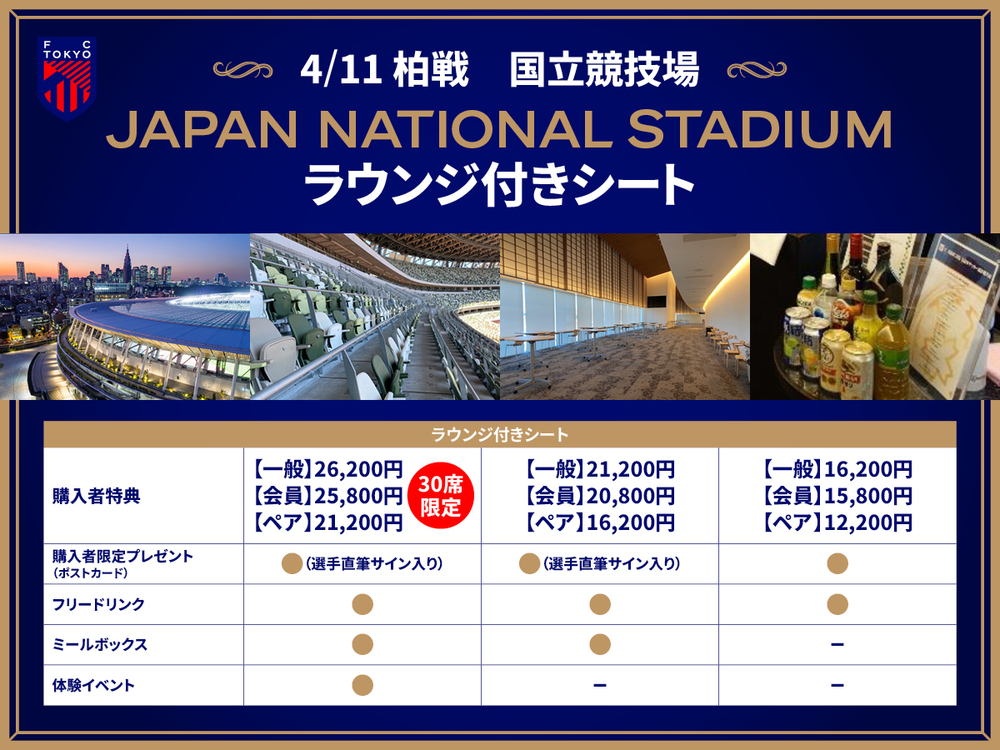 配备扶手垫的座位和仅限购买者使用的休息室,是位于两层主看台侧、与VIP专用休息室相同规格的特别区域。除了从开场到半场结束提供免费饮料外,还准备了各种特典。
