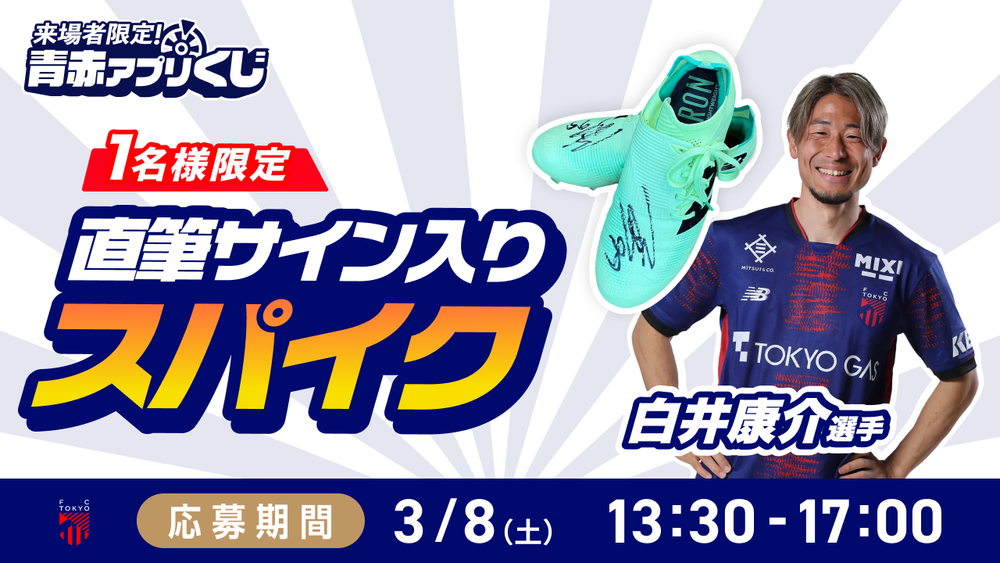 3月8日(周六)FC东京vs 湘南Bellmare,将举办仅限来访者使用FC官方应用的“青赤应用抽奖”活动。