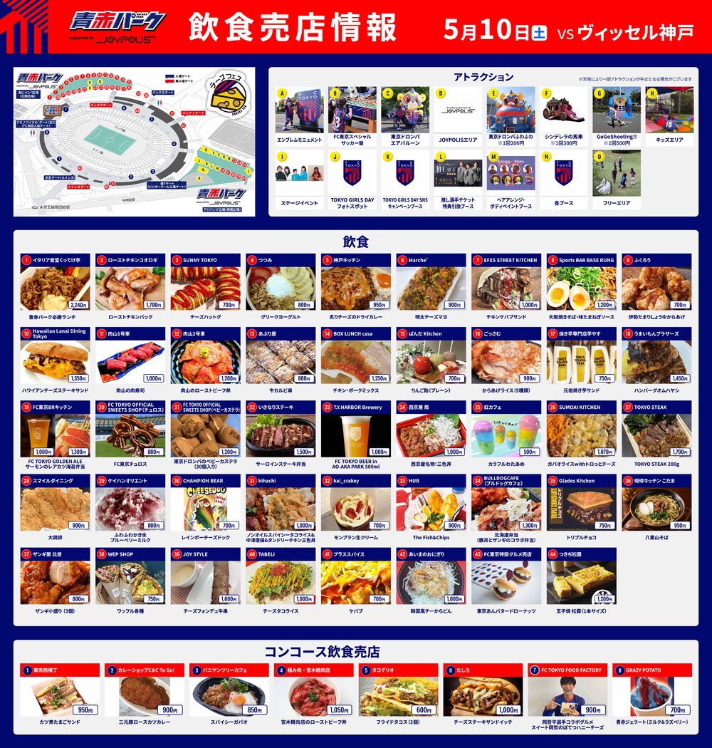 2025年5月10日(周六)明治安田J1联赛 第16轮 Vissel神户(15:00开球/味之素体育馆)的AO-AKA PARK supported by JOYPOLIS (场外)、出差!! AO-AKA PARK supported by JOYPOLIS、体育馆内走廊(场内)售货亭的饮食信息通知。