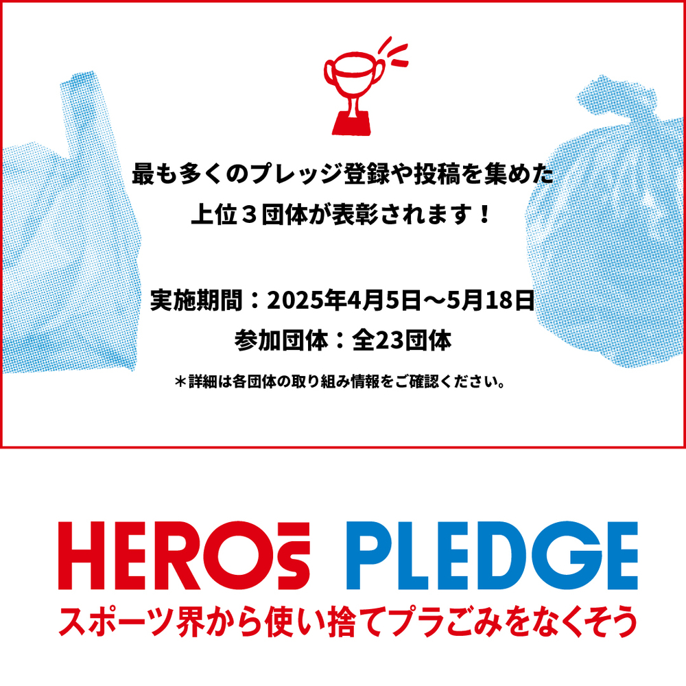 我们正在与其他参与统一行动的体育团体竞争,统计减少一次性塑料的宣言(PLEDGE)注册和带有标签“#HEROsPLEDGE”的SNS帖子总数。为了赢得比赛,需要所有粉丝和支持者的协助,请务必借此机会进行注册和SNS投稿!