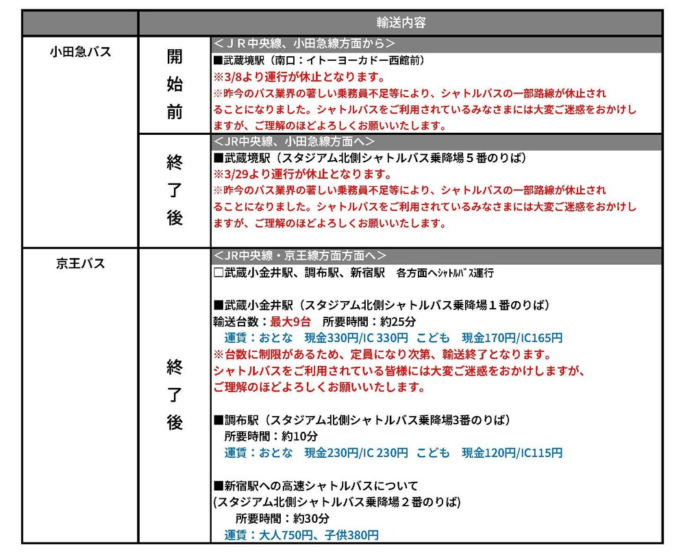 4月29日(周二祝) 2025明治安田J1联赛 第13轮 vs清水S-Pulse(13:05开球/味之素体育馆)期间运营的临时交通接驳(铁路)、穿梭巴士及路线巴士的相关信息。
