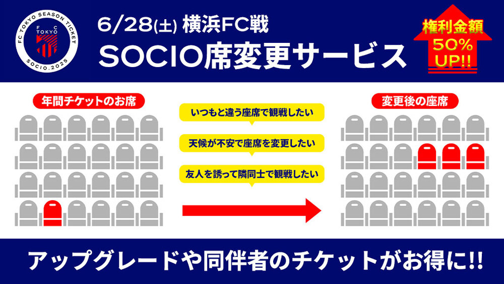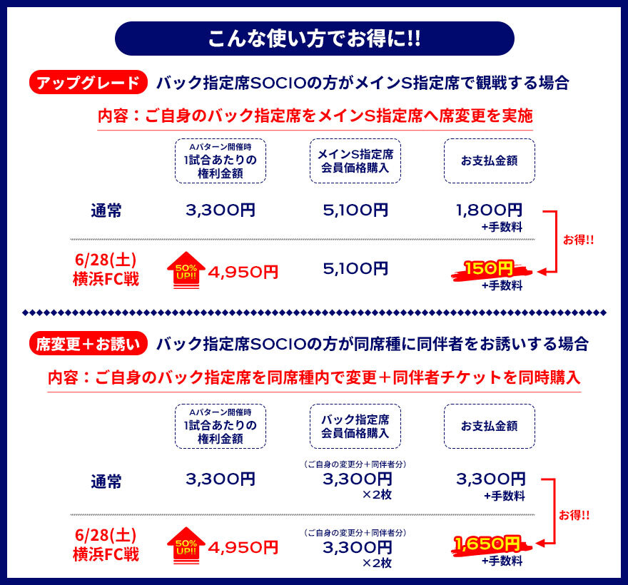 【升级及同伴者票更优惠!】6/28(周六) 横滨FC战 SOCIO席位变更服务权利金金额提升50%的通知