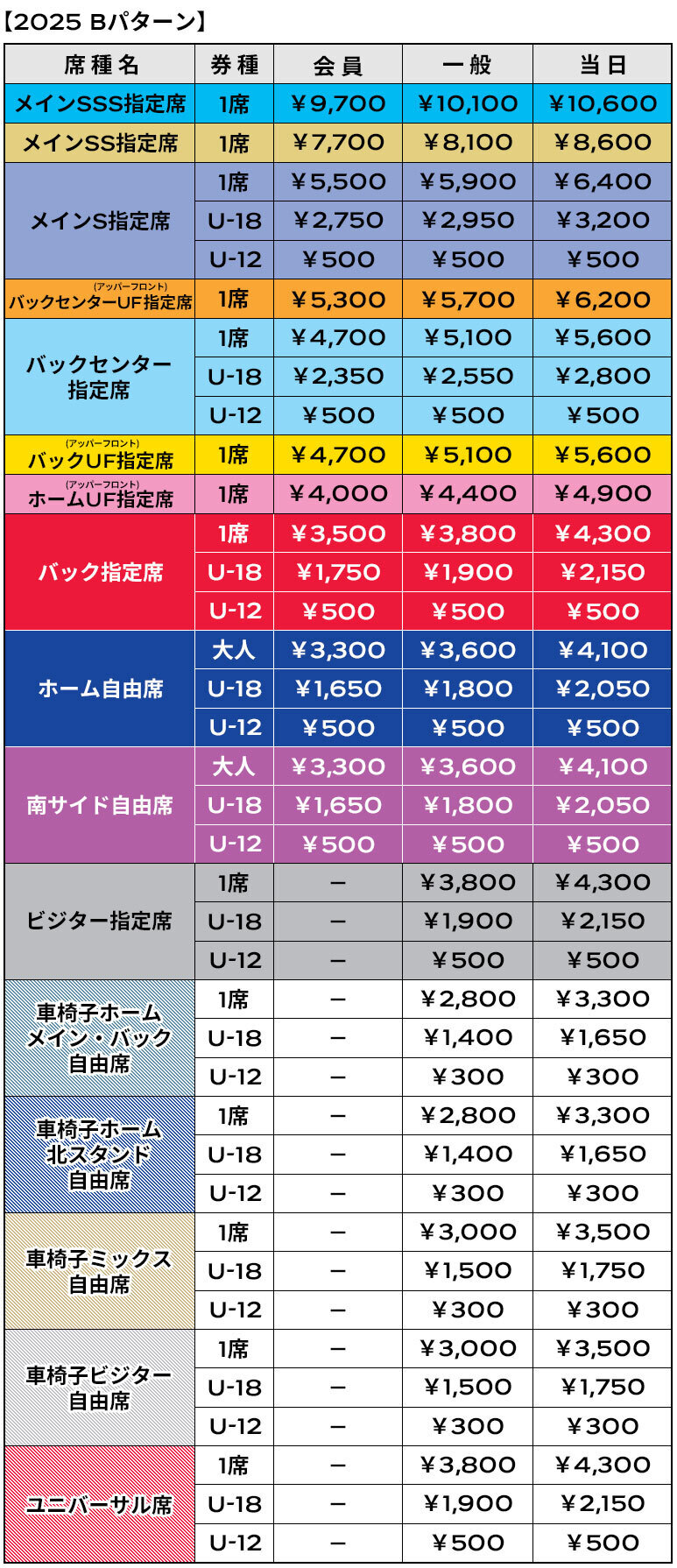 ※U-18票价适用于2007年4月2日及以后出生的人,U-12票价适用于2013年4月2日及以后出生的人。未入学的儿童在监护人膝上观看时无需购票