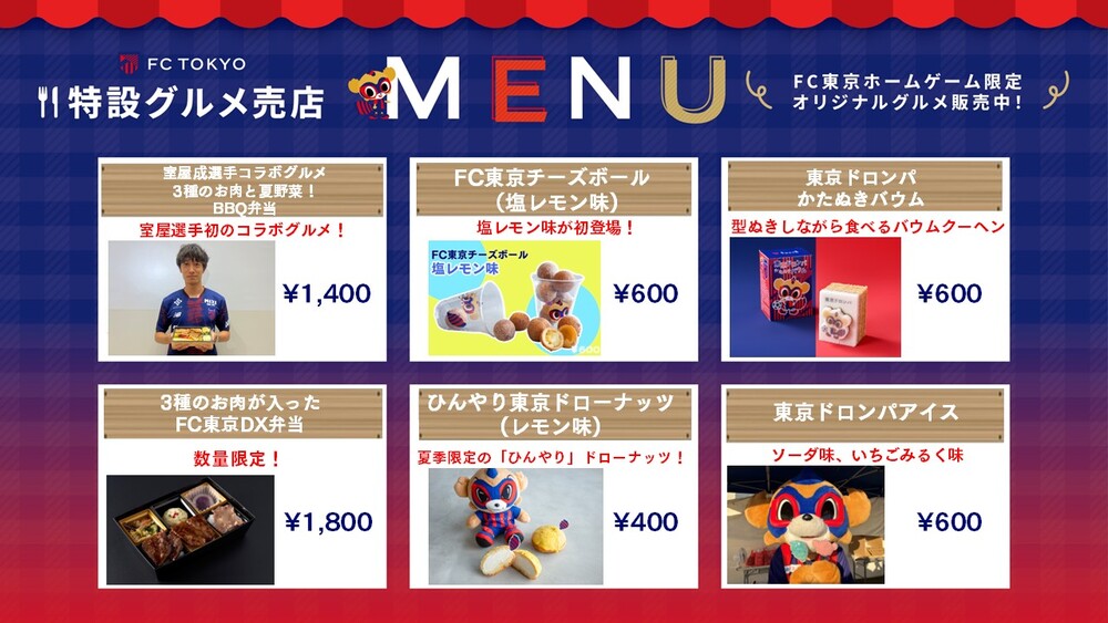 2025年6月28日(周六)明治安田J1联赛 第22轮 对阵横滨FC (19:00开球/味之素体育馆)的FC东京特别美食摊位信息通知。