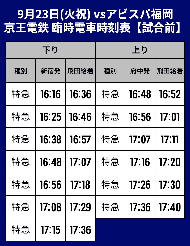 9月23日(周二祝) 2025明治安田J1联赛 第31轮 vs Avispa福冈(18:00开球/味之素体育馆)将提供的临时交通接驳(铁路)、穿梭巴士及线路巴士的相关信息。