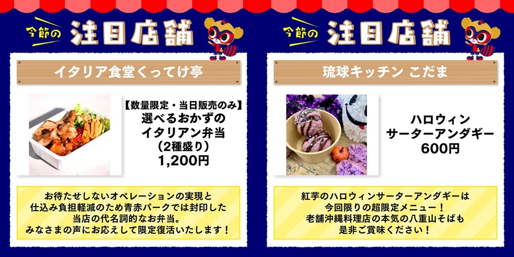 AO-AKA PARK supported by JOYPOLIS 的店铺将在①主看台外(人行天桥)、②通道(体育馆内通道)临时售货亭登场!