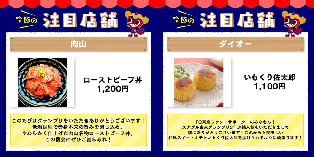 2025 斯塔格尔东京大奖赛 结果公布!! 2025/11/6 活动 我们将公布决定FC东京美食人气第一的“斯塔格尔东京大奖赛”的结果。9月19日(周五)至9月28日(周日)的总投票数为2,278票!感谢您在味之素体育馆现场投票及其他多种方式的投票。 在您提交的66个菜单中,投票结果如下! 顶级菜单将于12月6日(周六)Albirex新潟比赛时大集结!◇详情请参阅饮食信息。 今后也请务必享受FC东京的体育馆美食『スタグル东京』。
