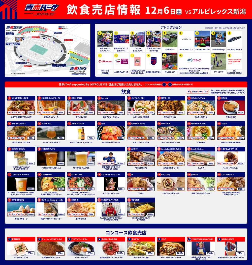 12月6日(周六)2025明治安田J1联赛 第38轮 vs Albirex新潟(14:00开球/味之素体育馆)的,AO-AKA STREET、AO-AKA PARK supported by JOYPOLIS(场外)、出差!! AO-AKA PARK supported by JOYPOLIS、体育馆内走廊(场内)售货亭的饮食信息通知。
