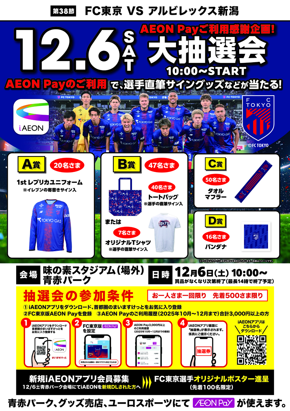 12月6日(周六) 2025明治安田J1联赛 第38轮 vs Albirex新潟(14:00开球/味之素体育馆)期间,官方合作伙伴永旺株式会社将设立展位。