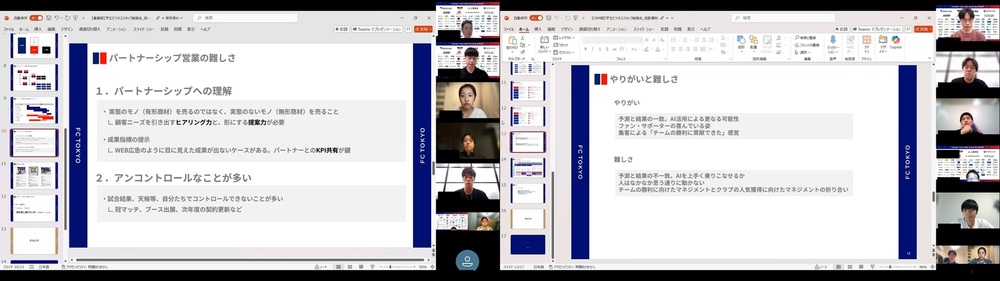 本次研讨会中,进行了关于合作伙伴销售、与粉丝及支持者的沟通设计、数据利用实践等各部门所承担的专业领域的讲座,成为学生商务工作人员广泛输入平时较少接触的业务知识的场所。此外,通过从多个部门的视角理解俱乐部运营,也成为学生加深对自己负责业务定位及俱乐部整体协作重要性的理解的机会。