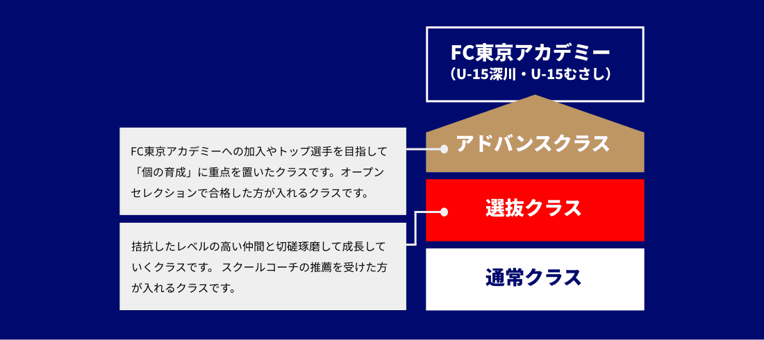 作为青少年世代的最高级别课程,“高级班”和“选拔班”不仅包括FC东京学院的U-15深川、U-15武藏,还致力于培养未来在FC东京一线队作为职业球员活跃的个人,重点进行个体培养指导。
