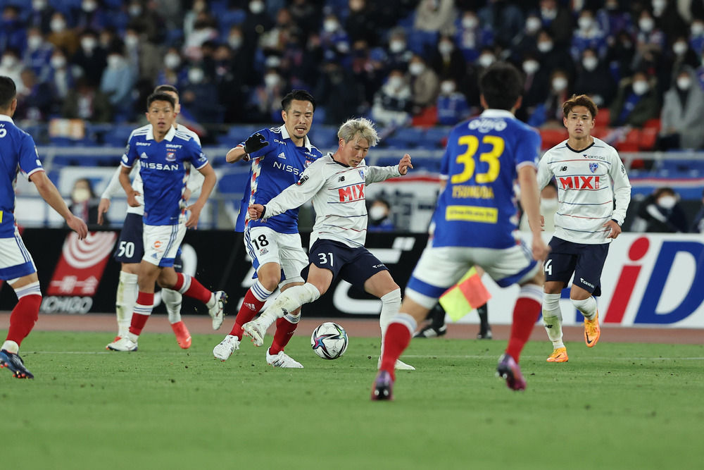 從上半場中盤開始,對手持球時間持續增加,東京隊仍未放鬆高壓逼搶,積極創造機會。上半場21分鐘時,對手在防守間傳球時,紺野選手猛烈施壓成功搶斷。與守門員的一對一射門被擋下,第二波球由迪奧戈選手跟進,接著Adailton選手也加入攻勢,但連續三次射門都被頑強防守的橫濱FM防線封堵。上半場33分鐘,安部選手在中線附近偏左位置搶下球權,迪奧戈選手隨即帶球向前推進。球傳到對側的紺野選手,紺野選手在擅長的區域用左腳射門,但球稍稍偏向球門左上方。松木選手趁著對方門將快速開球時搶斷,立刻射門,但球偏向球門右側出界。