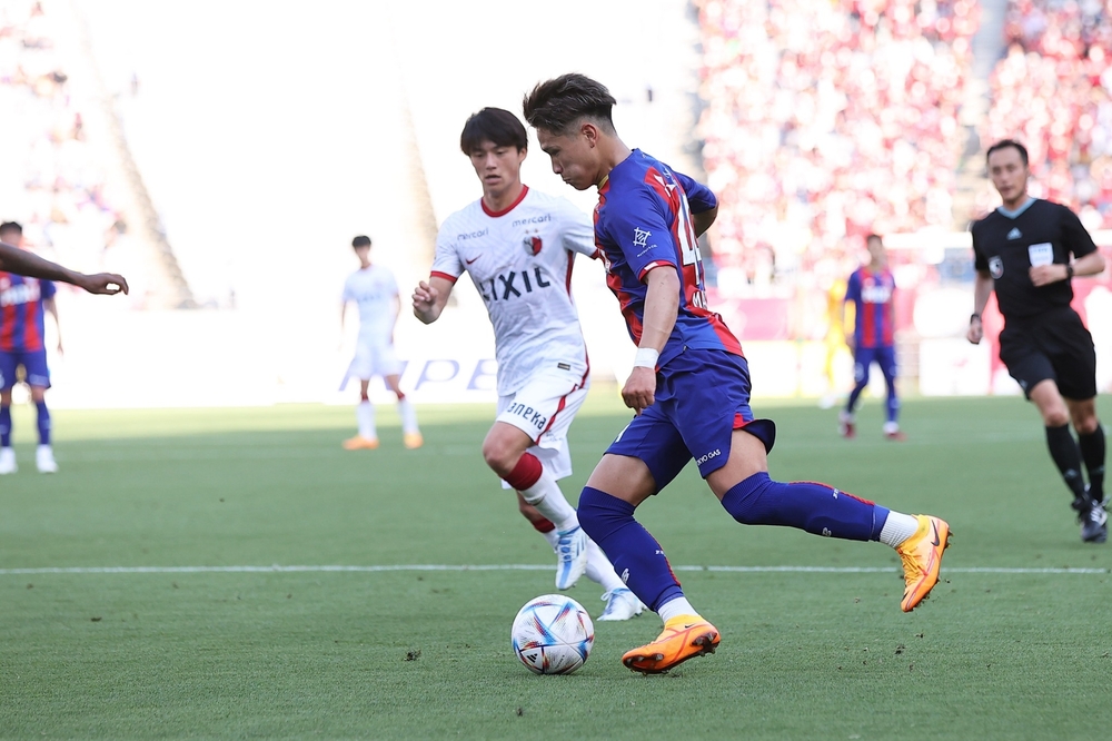 東京想要保持控球並冷靜地推進比賽,但鹿島在球際嚴格對抗,對持球者施加連動的壓迫,使得東京無法找到組織進攻並進入對方半場的路徑。在奪回球權反擊的場面中,因為急於進攻而輕易失球,反被鹿島以強烈快速的縱向攻勢壓制,不斷被迫將球回傳至自陣。雖然難以形成攻擊型態,但在上半場23分鐘時,東京將球帶入對方半場深處,松木玖生選手在左側開出接球,並傳出楔形球給進入禁區中央的Diego OLIVEIRA選手。Diego選手吸引防守者後傳球,渡邊凌磨選手從背後插入一觸配合射門,但球偏高飛出球門。雖然持續遭遇縱向球飛來飛去的苦戰,但在上半場33分鐘改變傳球節奏,推動比賽進展。持球於左側高位的小川選手,傳出楔形球給中央區域的渡邊選手。渡邊選手與Diego選手以一觸配合吸引數名對手,渡邊選手隨即侵入被吸引對手空出的禁區內空間。渡邊選手比追擊的防守者更快,將球射入球門右下角,東京成功先馳得點。