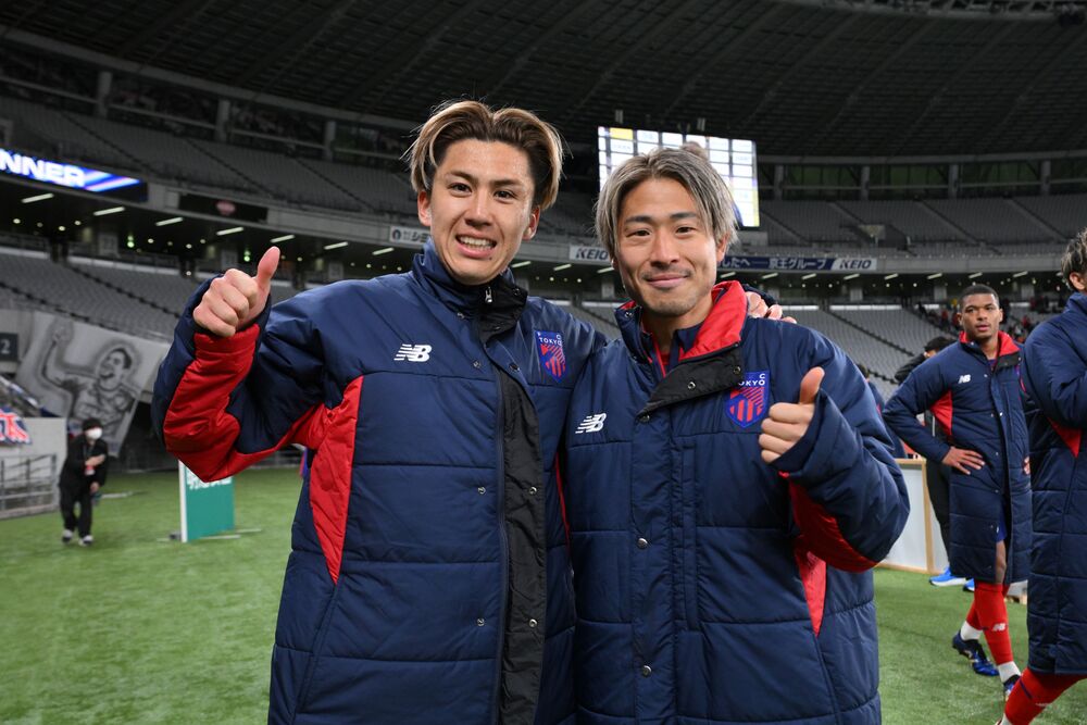 A、現在在東京隊中,讓我覺得絕對不想輸給的選手應該是(白井)康介吧。不過,我們真的很要好。最初是在JFA・J聯盟特別指定選手時參加的沖繩訓練營中同房開始的。從那時起我們就成為好朋友,現在練習場的置物櫃也相鄰。上賽季我擔任邊鋒,康介擔任邊後衛,我們經常組成縱向關係,我認為在那裡建立了良好的互補關係。例如在球門球時我會去搶球,然後回防補位的情況也很多。因為我沒有爆發性的突破力,所以康介會透過重疊跑動來幫助我。我們彼此在場上互相幫助,建立了良好的關係。自然地,我們的對話也增加了,兩人一起吃飯的機會也變多了。本賽季我們連續第二年在沖繩訓練營同房,休賽期間還一起去了離島。嗯,康介在2023賽季夏天轉隊過來,原本認識的朋友不多,適應得不太好,覺得他很可憐,所以我才陪著他啦(笑)。