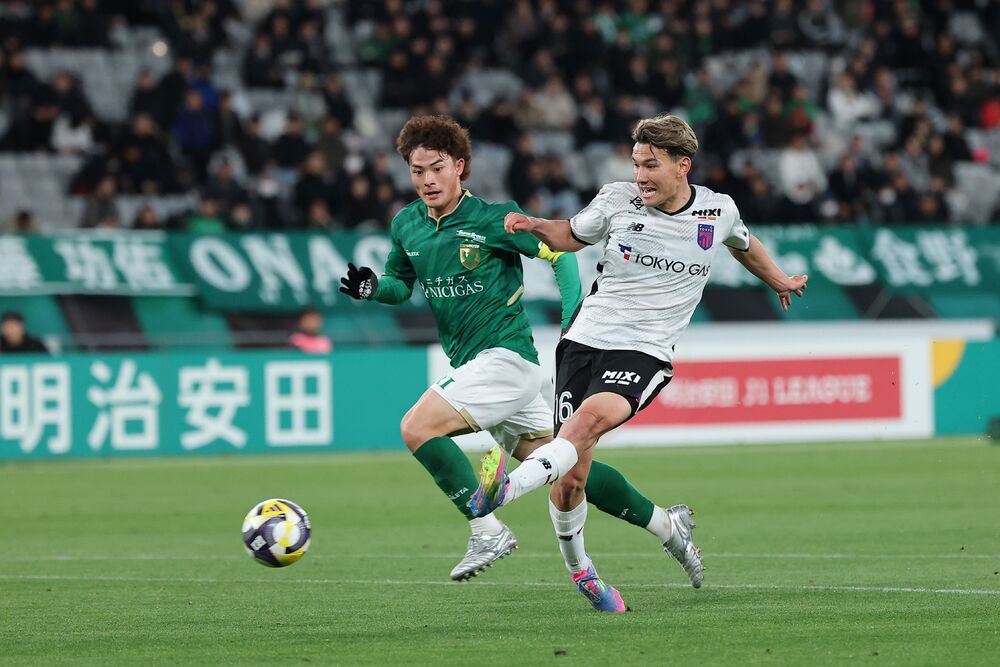 就在3分鐘後。想要反擊的東京隊透過精彩的配合,最後由田晃太選手輕輕推射,但射門擊中對方守門員Matheus選手的腳,打在左邊的門柱上。