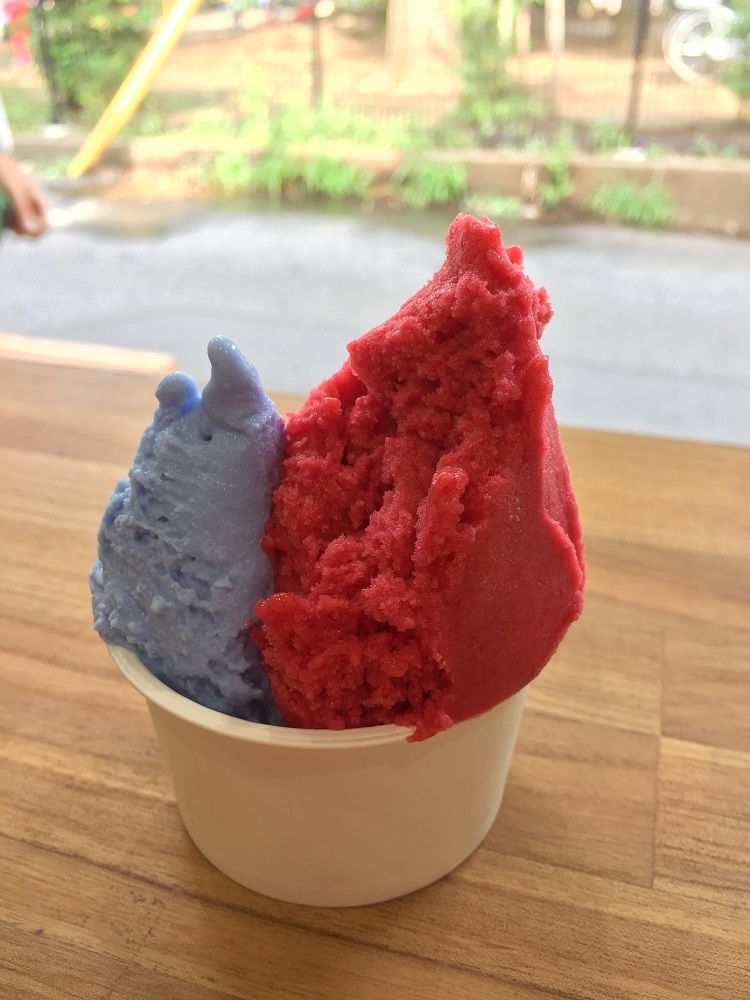 販售以FC東京為形象的青紅色義式冰淇淋(鹽麴與覆盆子)等原創義式冰淇淋