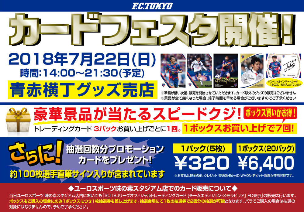 7/22(周日)2018明治安田生命J1聯賽第17節vs橫濱FM・馬里諾斯(19:00開球/味之素體育館)的體育場南側廣場(阿吉潘達廣場)舉辦的「大青赤橫丁(美食廣場)」特設商品販賣處,將舉辦慣例的『卡片嘉年華』!有機會抽中選手簽名比賽用球或相框!歡迎大家來「大青赤橫丁」的特設商品販賣處參觀!期待您的蒞臨!