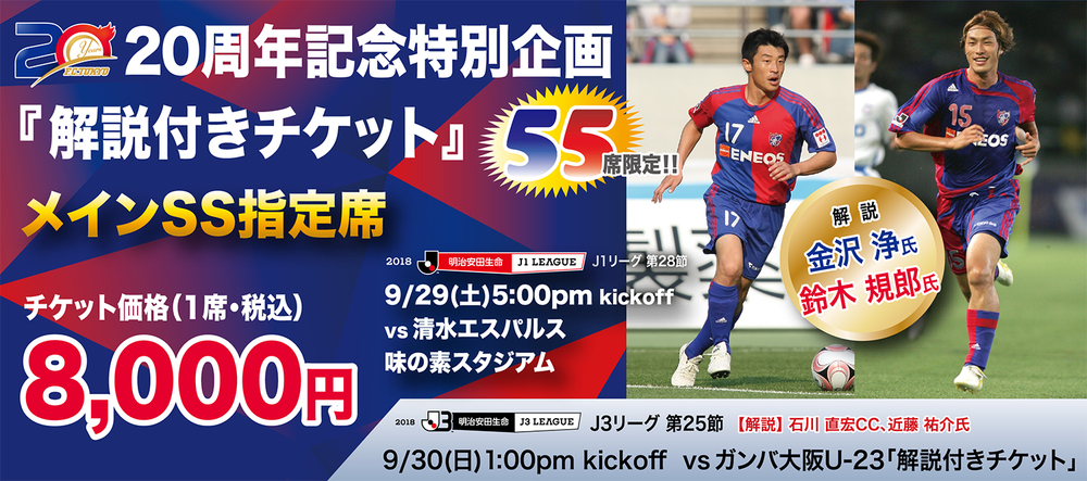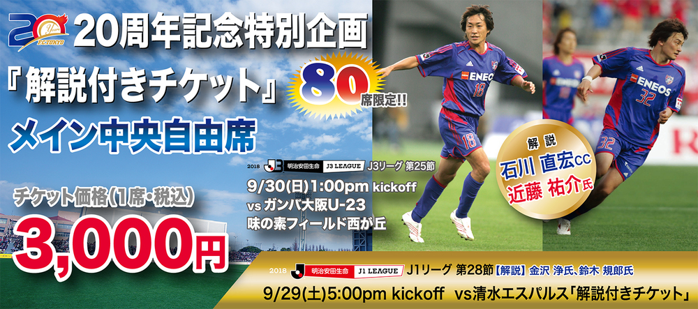 9月29日(周六)清水S-Pulse戰以及9月30日(周日)Gamba大阪U-23戰,將販售可一邊聆聽曾在FC東京活躍的兩位OB特別解說,一邊觀賽的企劃票券「附解說票」!敬請務必購買!