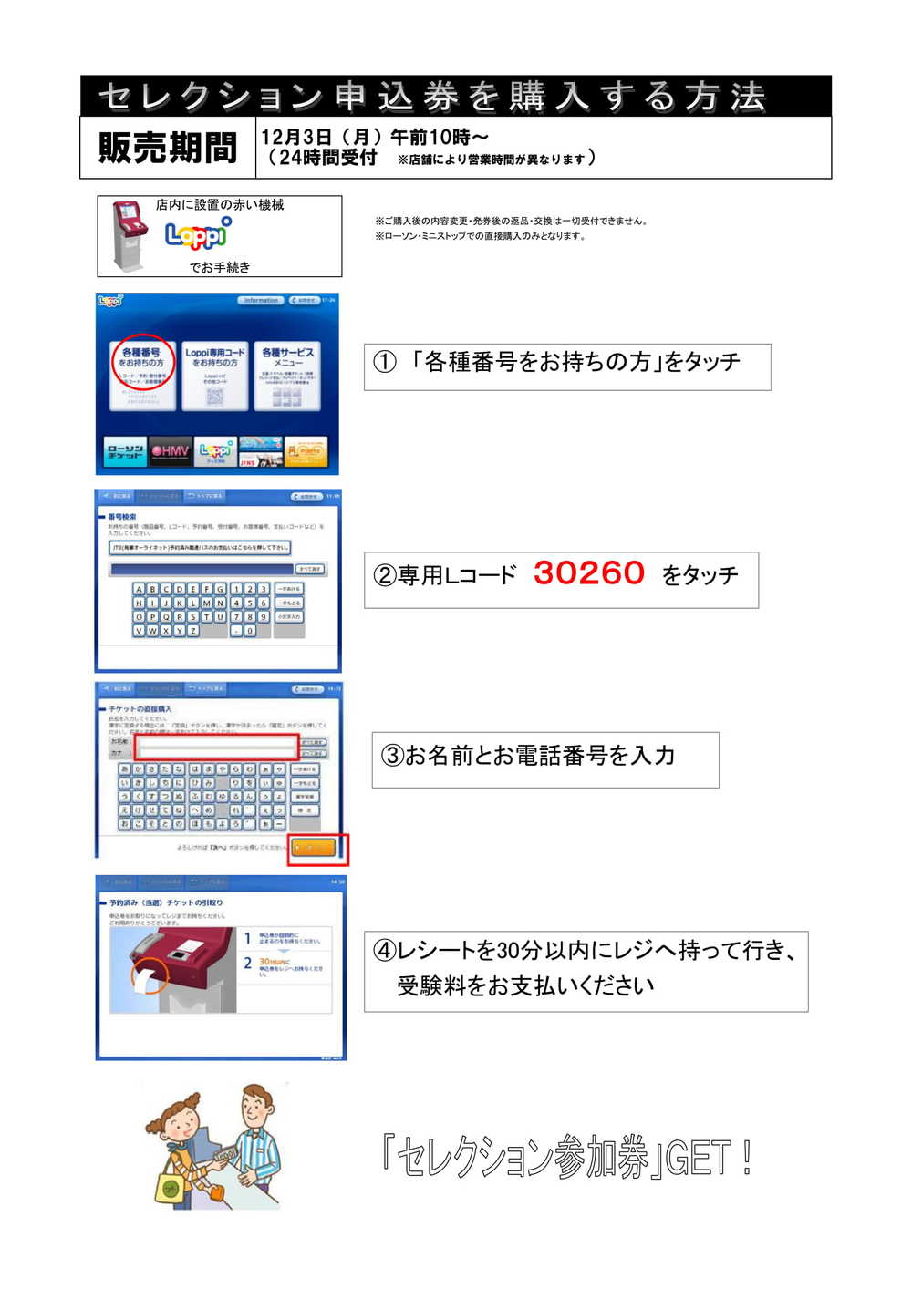 在您附近的Lawson或Mini Stop便利店內設置的Loppi機器購買選拔會的≪參加券≫。
