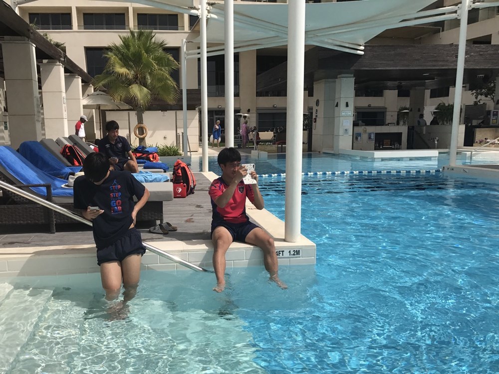 練習後,由於身體在高溫環境下感到發熱,選手們會在飯店的游泳池中進行降溫。選手們會採取各種方法來消除疲勞感!