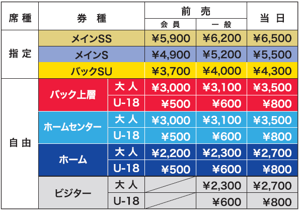 將與J1聯賽相同的座位劃分及價格。