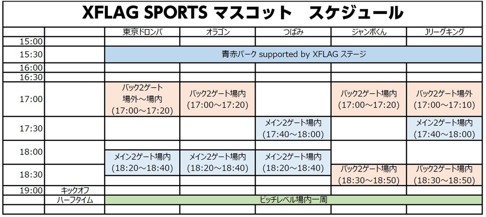 (1)15:30~16:00 → 「AO-AKA PARK supported by XFLAG」舞台(TOKYO DOROMPA、オラゴン、つばみ、ジャンボくん、Jリーグキング)