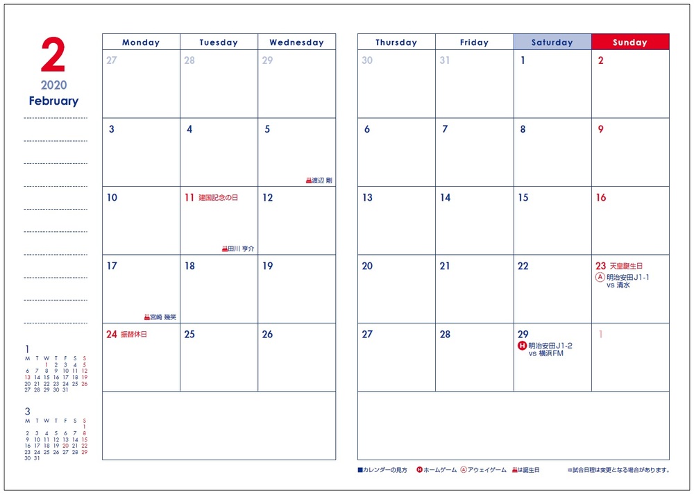 這次將實施「FC東京2020行事曆」的預購販售。本行事曆記載了比賽日程。封面採用預購商品特有的設計,可以放入您喜愛球員的號碼和名字,呈現球衣風格。請務必盡早預約!