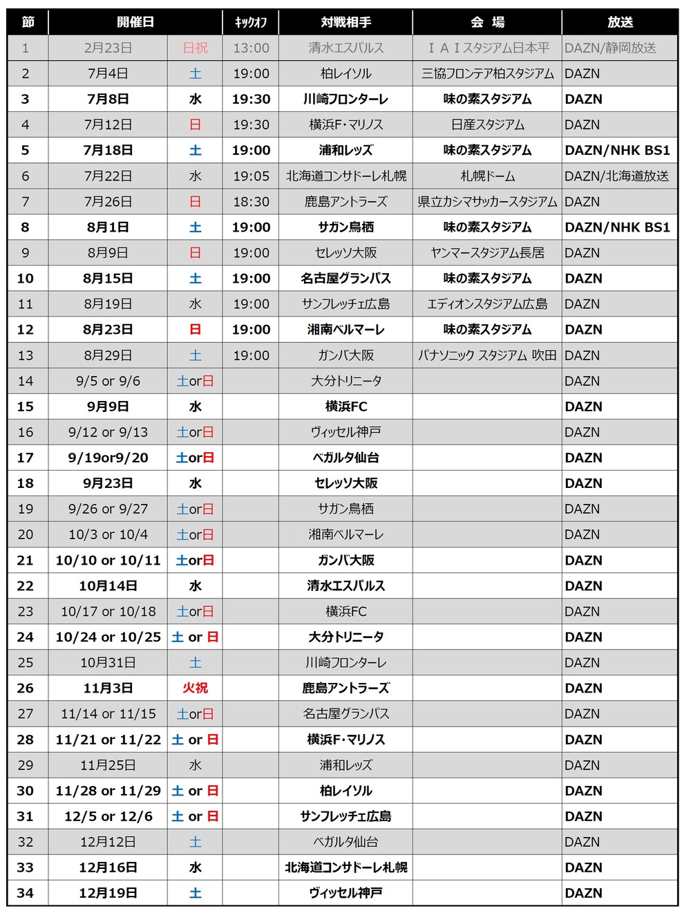 ※第14節以後的賽程詳細,預計將分別於8月初和10月初公布。