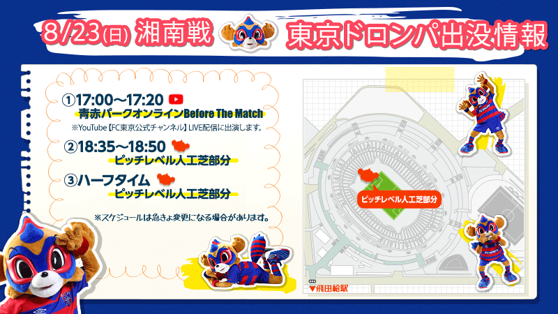 8/23(周日) 2020明治安田生命J1聯賽第12節 vs湘南Bellmare(19:00開球/味之素體育館) TOKYO DOROMPA將如以下所示登場。敬請期待!